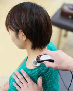 自賠責保険適用の交通事故むちうち施術 電気治療と手技で首肩の痛みをケアする様子|名古屋市中区鶴舞のかんとま整骨院